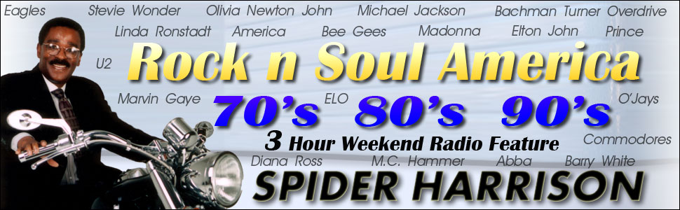 'Spider Harrison's ROCK n SOUL AMERICA' is a three-hour weekend program. "Playing the Top 40 & Soul hits": playing the hits with "stack 'em up and counting them down" - this is the theme along with playing songs that were "made and played in America first". Between records the personality of Spider Harrison delivers with a different and unique entertaining style. There is a nostalgic element to each show coupled with a brand new twist, jellying pop, rock and soul hits of the 70's, 80's and 90's. There will also be mini 'Whatever Happened To?' features spicing up the mix.